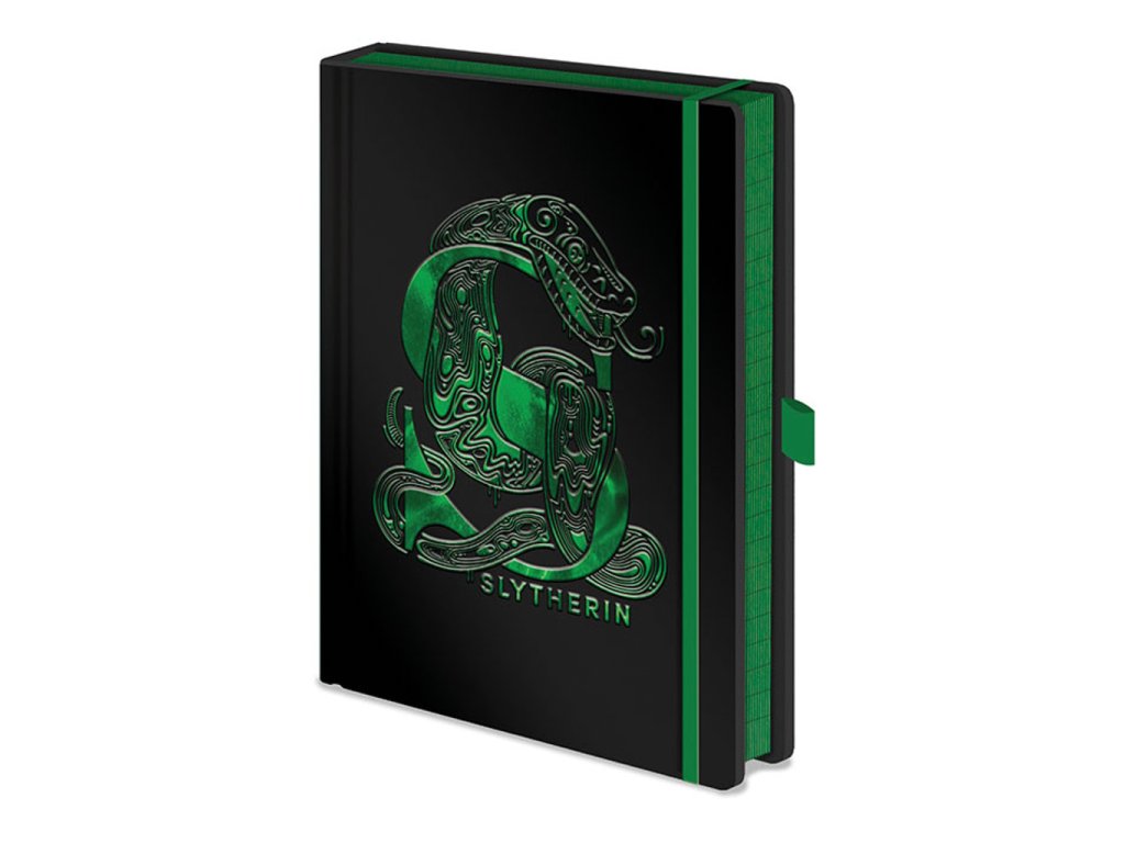 Pěkný linkovaný zápisník v pevných deskách ve stylu koleje Zmijozel (Slytherin) z příběhů o Harrym Potterovi. Svěřte své nápady a poznámky krásně provedenému hadímu patronovi zmijozelské koleje! Součástí zápisníku je gumička na zavírání.