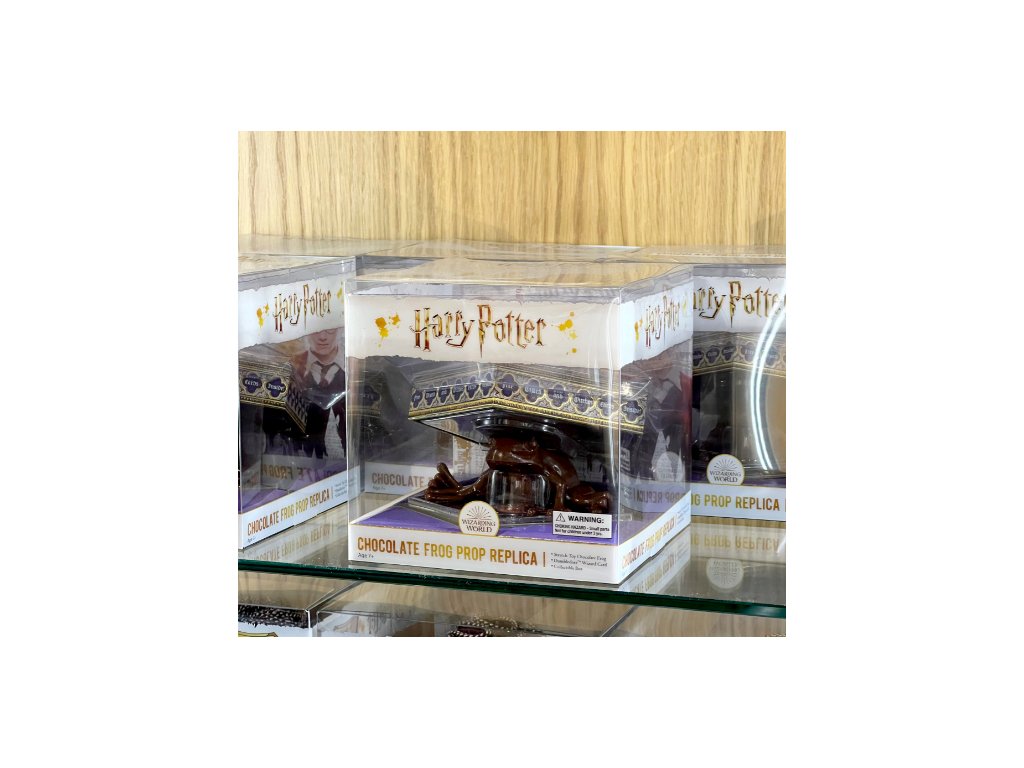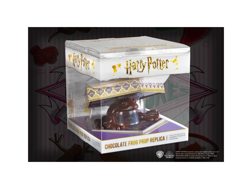 Nejedlá replika čokoládové žáby. Rozmačkejte ji, natáhněte, rozmačkejte nebo ji jen obdivujte na stole. Součástí je detailně propracovaná krabička na památku a Brumbálova karta slavných čarodějů a kouzelníků.