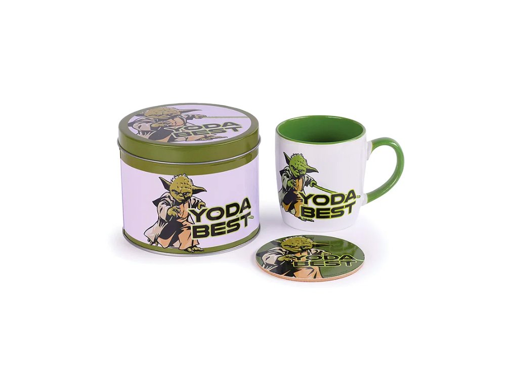 Dárková plechovka pro fanoušky Star Wars. Keramický hrnek, korkový podtácek s vinylovým povrchem i samotnou plechovou krabici.