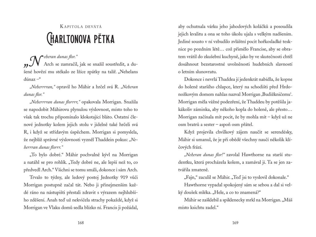 Morrigan sice zlomila svou smrtící kletbu a vykonala nebezpečné zkoušky, ale její cesta k Nikdyuši a všem jeho tajemstvím teprve začala. A ona rychle zjišťuje, že ne všechna magie se využívá pro dobrou věc. Morrigan dostala pozvání vstoupit do Divinské společnosti, která jí slibovala přátelství a ochranu, ale kdosi ji a její společníky vydírá, takže i těch pár věrných přátel se obrací proti ní. Zbaví se Morrigan někdy svého prokletí?