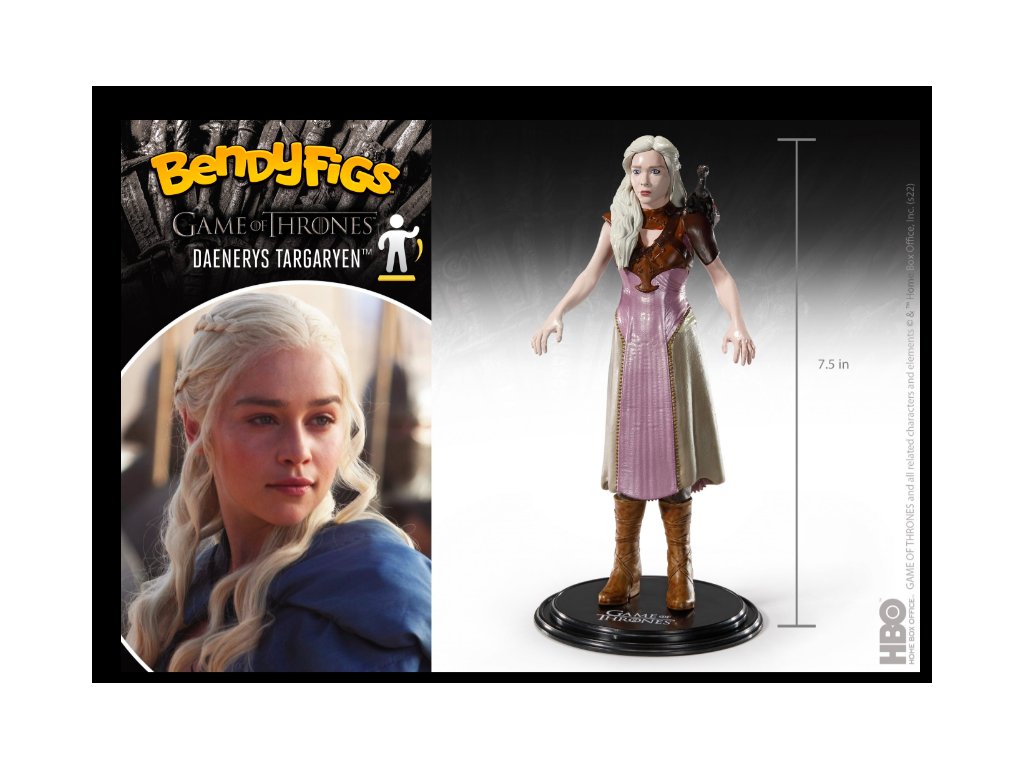 Autentická, složitá ohýbací figurka Matky draků Daenerys Targaryen o výšce přibližně 7,5″. Dodává se se stojanem pro volitelné vystavení.