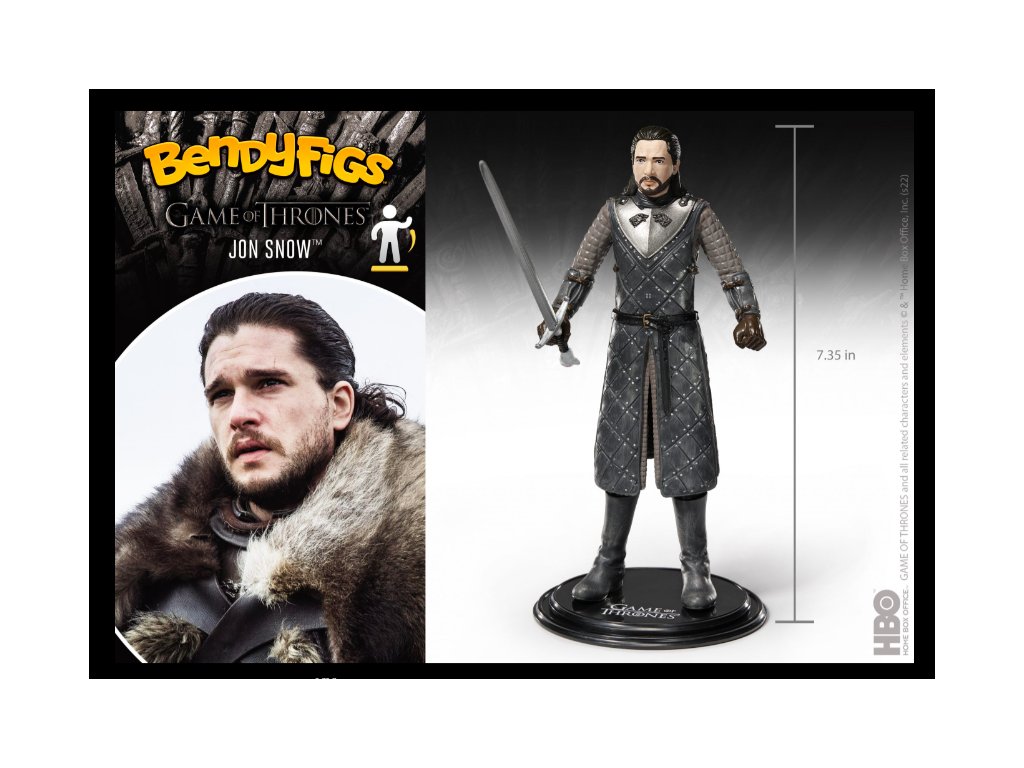 Autentická, propracovaná ohýbací figurka Jona Snowa měřící na výšku přibližně 7,35″. Dodává se se stojanem pro volitelné vystavení.