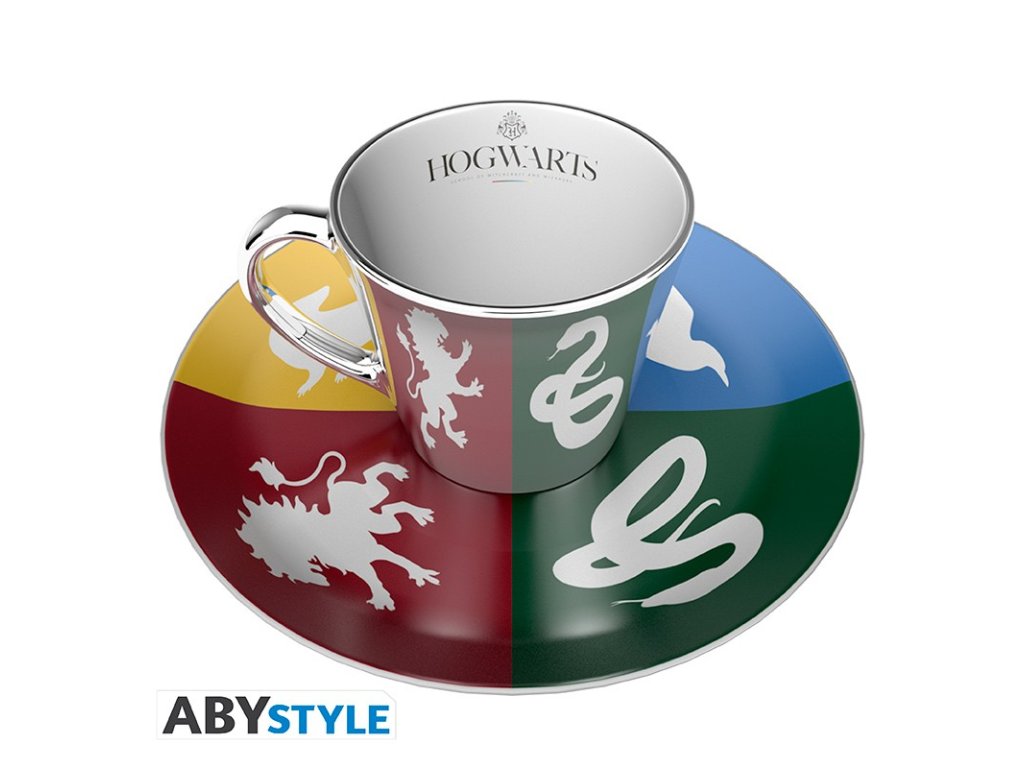 Na této sadě zrcadlového hrnku a talíře Harry Potter od ABYstyle jsou vyobrazeny všechny domy Bradavic.