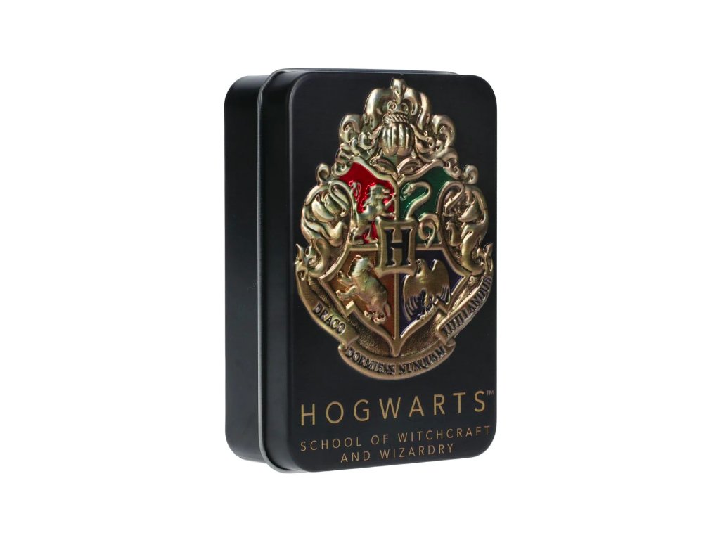 Sada se dodává v kovové reliéfní černé plechovce s ikonickým znakem Bradavic.
