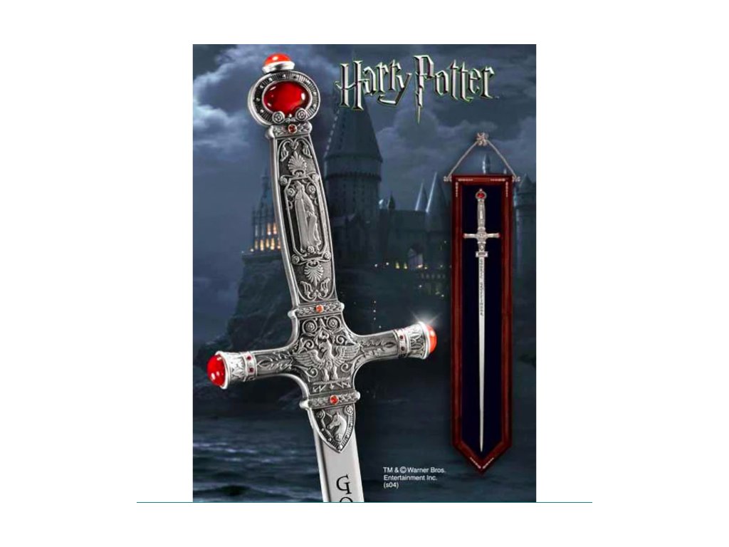 Nádherná rekonstrukce meče Godrika Nebelvíra se složitě propracovanou rukojetí osázenou křišťálovými kabošony.
