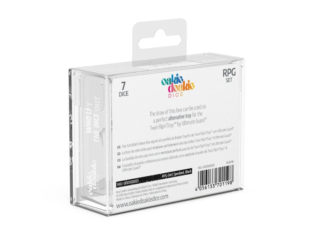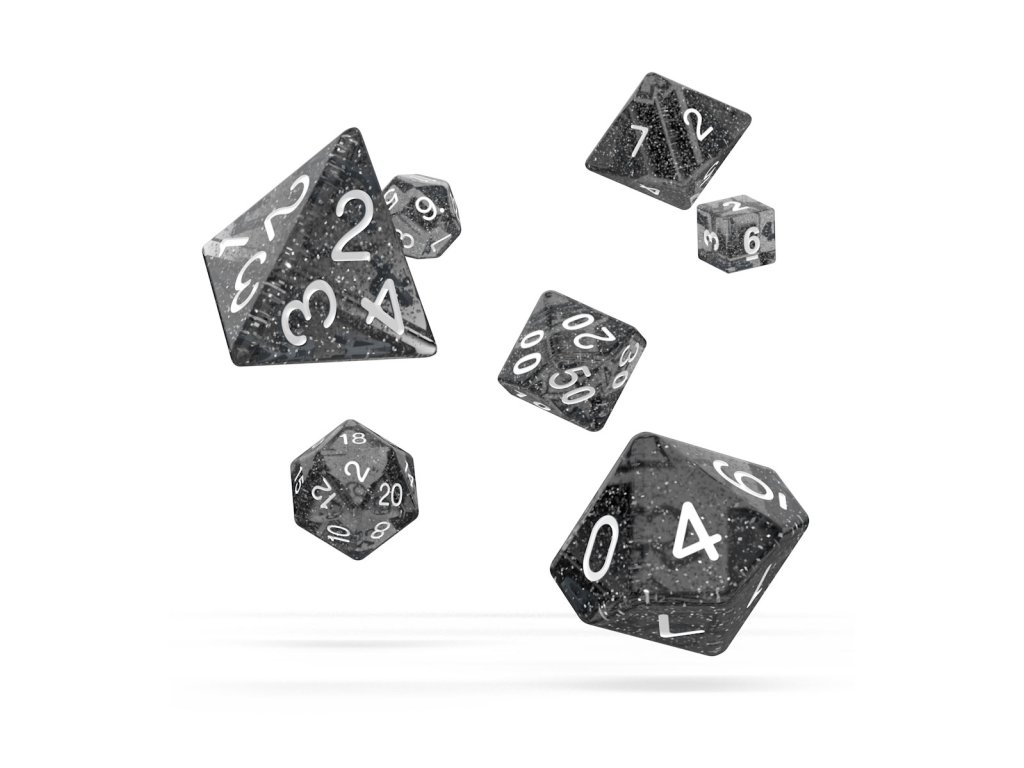 Sady pro hru na role se skládají ze 7 různých kostek: D6, D4, 2x D10 (stupně 1 a stupně 10), D8, D20 a D12. Jsou zabaleny v pevných krabicích s výsuvnými policemi, takže si je můžete snadno vzít s sebou a hrát, kdekoli budete chtít.