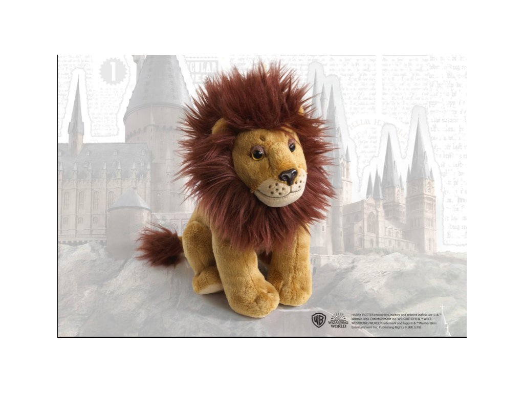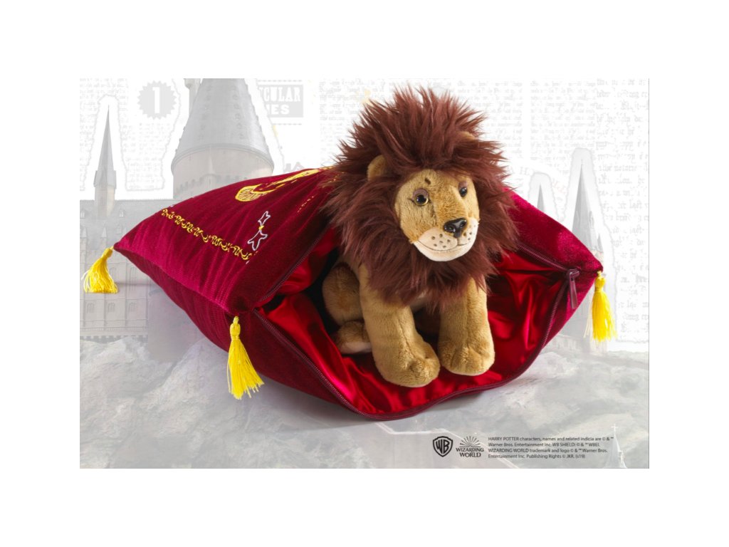 Tento vyšívaný polštář s nebelvírským erbem o rozměrech přibližně 34 cm čtverečních obsahuje plyšového maskota nebelvírského lva, který se objevil ve filmech o Harrym Potterovi.