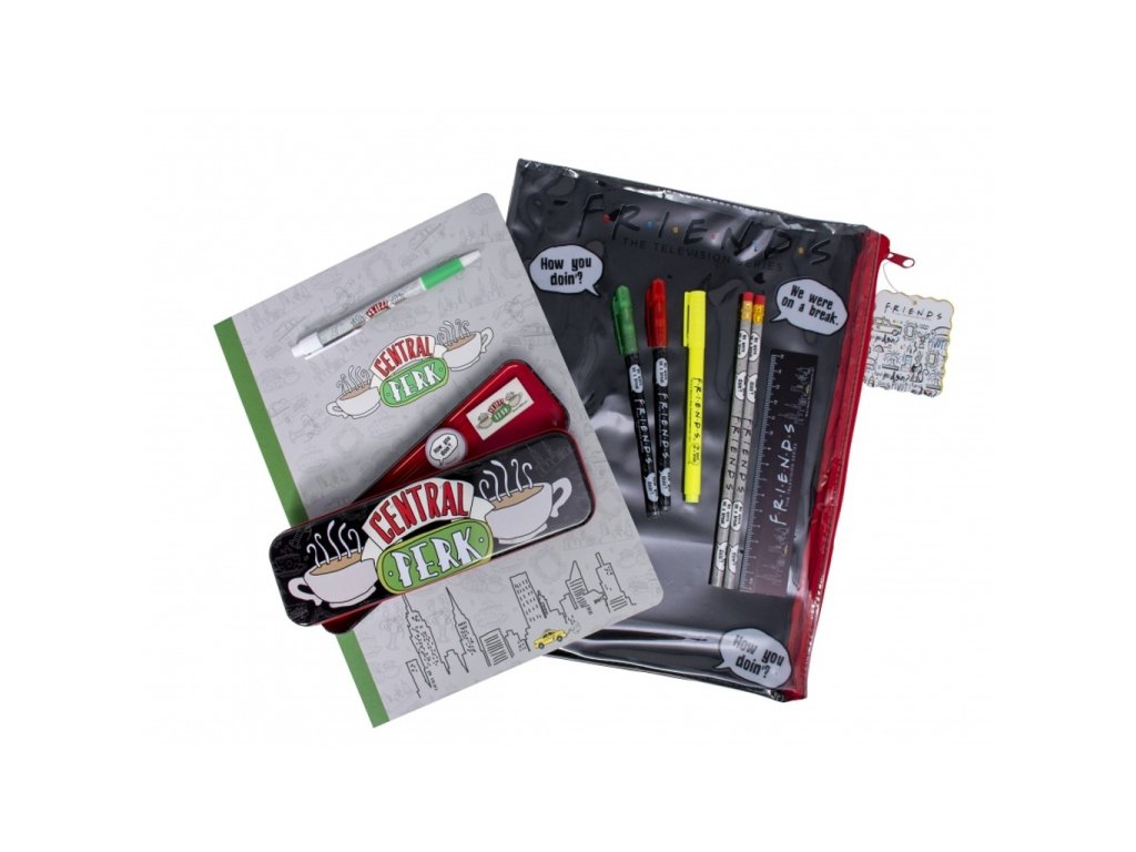 Velý školní set pro fanoušky seriálu Přátelé. Balení obsahuje kovový penál, blok A4, sadu propisek, tužky, zvýrazňovač a pravítko. Vše baleno v transparentním pouzdro pro opakované využití.
